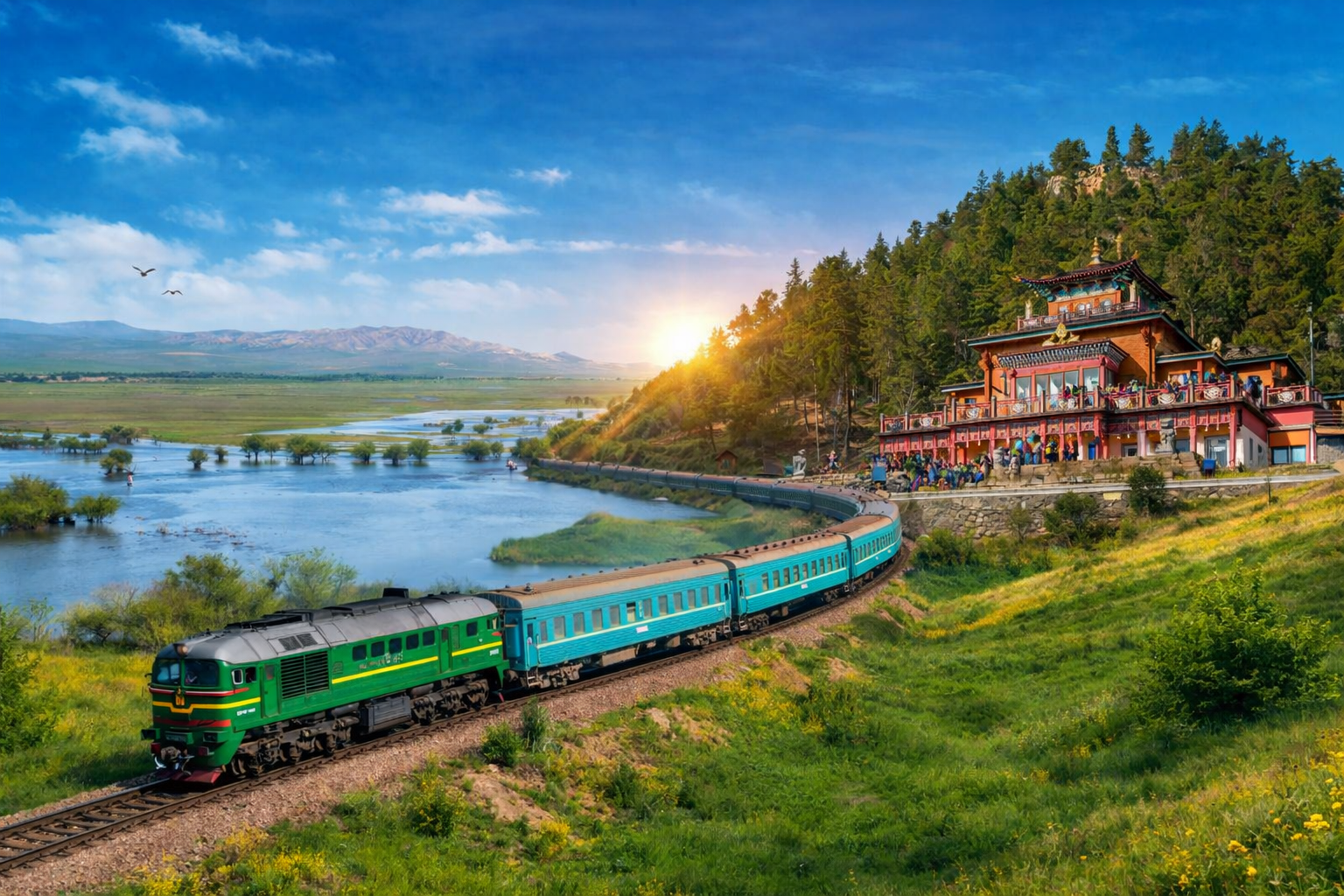朝、ホテルから駅へ向かい、ノスタルジックな鉄道の旅が始まります。大草原の中を走る列車の車窓を楽しみ、ダワーン駅に到着。そこから専用車で聖なる「アグラグ・ブテール寺院」へと向かいます。